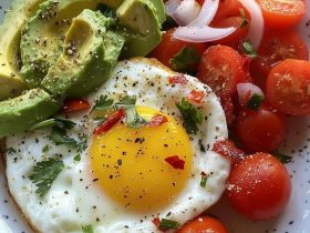 A vibrant and protein-packed plate featuring sunny side-up eggs paired with creamy avocado, tangy onions, juicy cherry tomatoes, and a ...